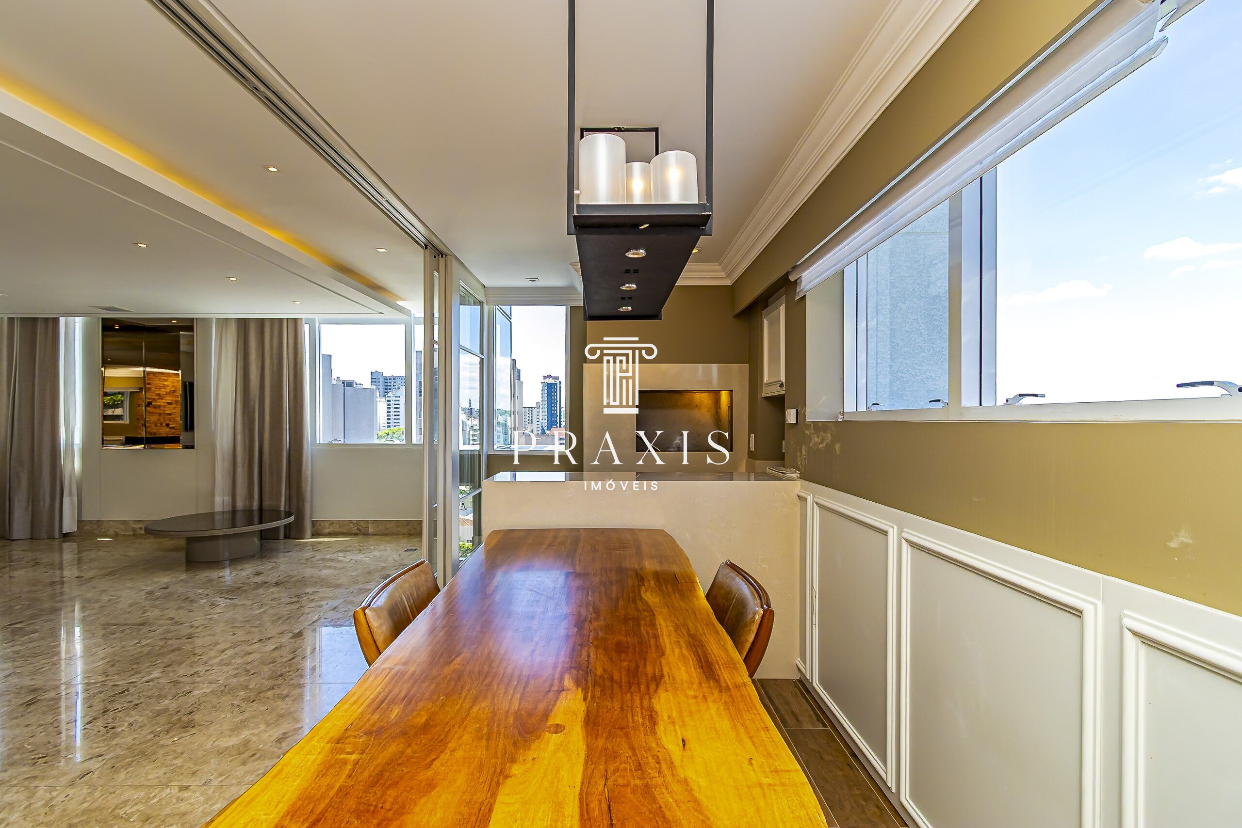 Localizado em andar alto, o apartamento é bem ensolarado e oferece uma vista aberta e agradável. O acesso por elevador privativo garante discrição e exclusividade. O amplo living para três ambientes conta com teto em gesso, ar-condicionado, piso em porcelanato, lavabo e churrasqueira integrada, compondo um espaço elegante e acolhedor para receber e conviver.