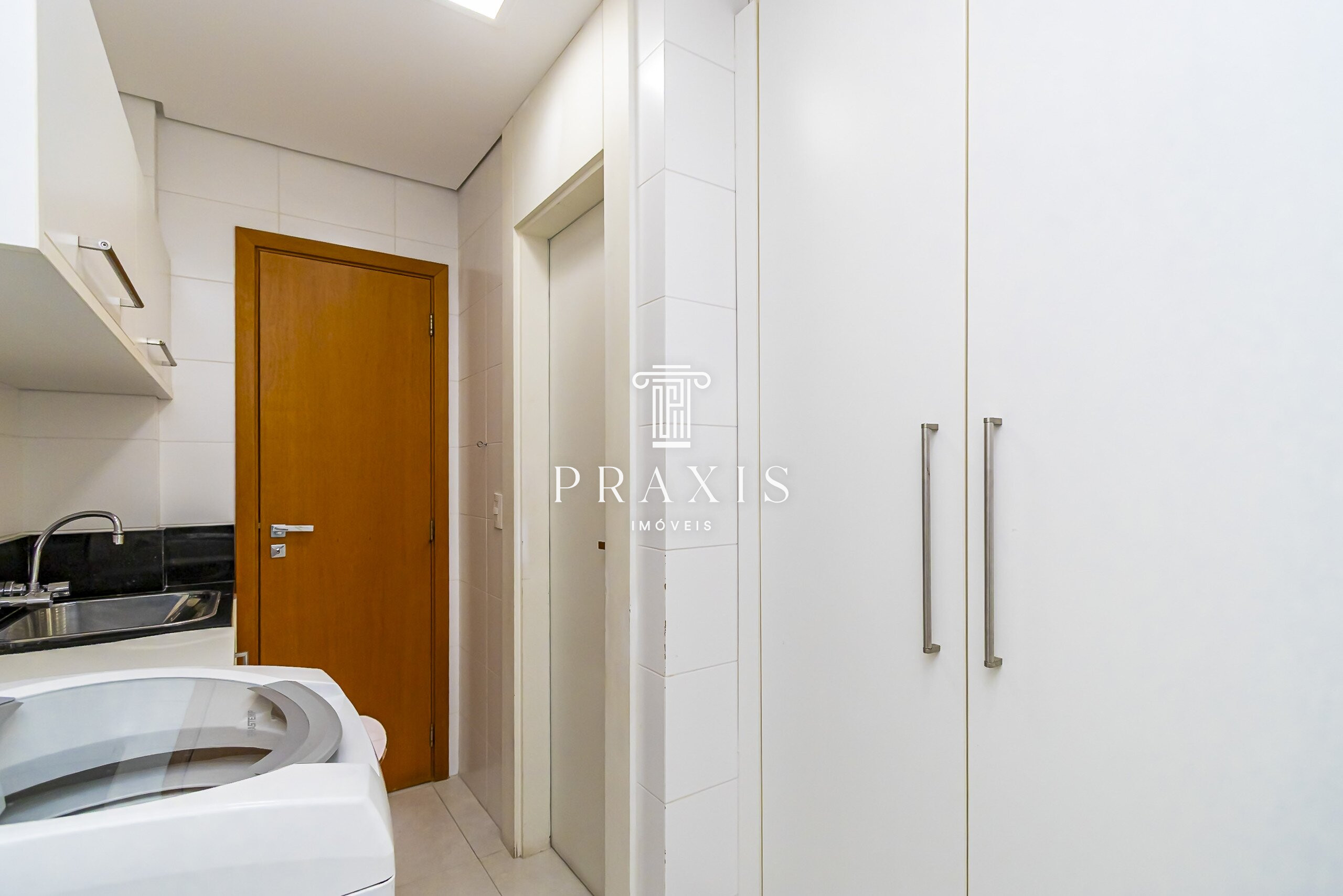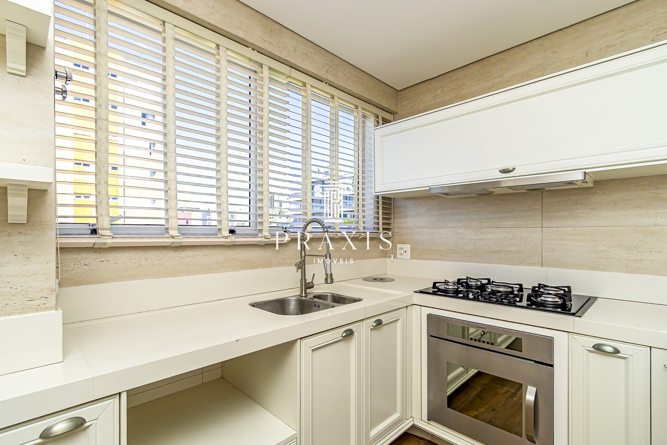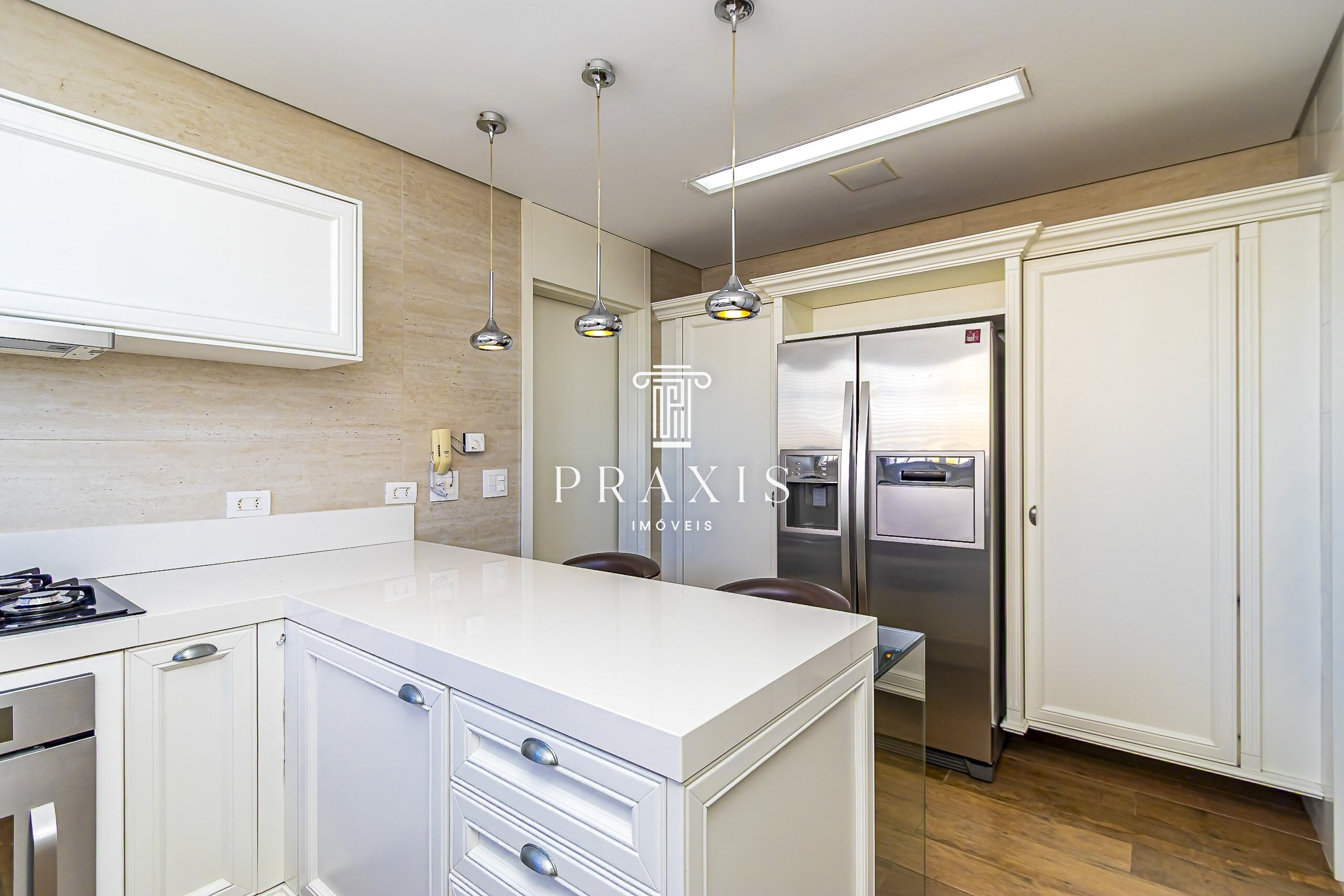 A cozinha possui marcenaria planejada e está equipada com cooktop, forno embutido e geladeira duplex, além de área de serviço com máquina de lavar roupas e dependência de empregada.