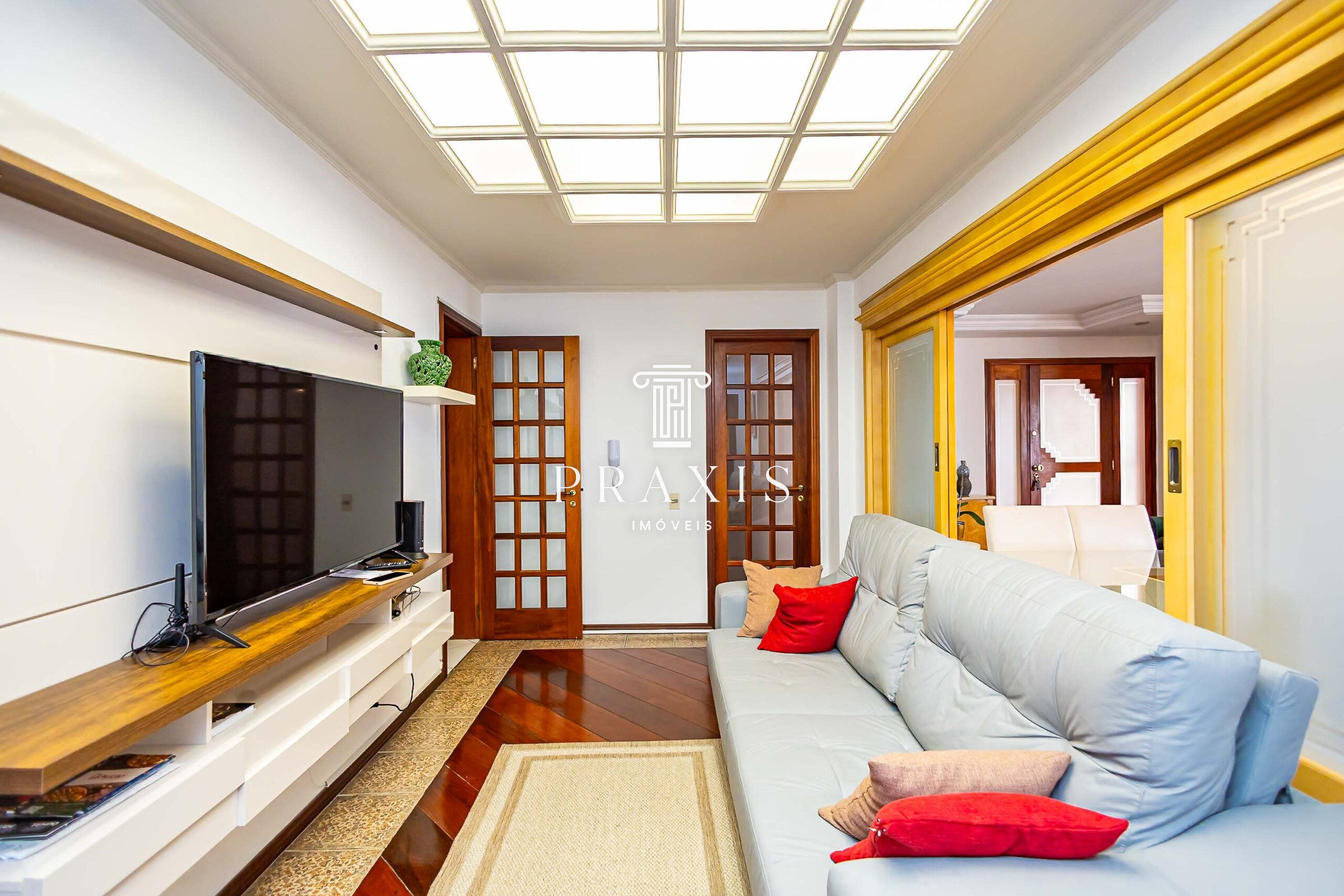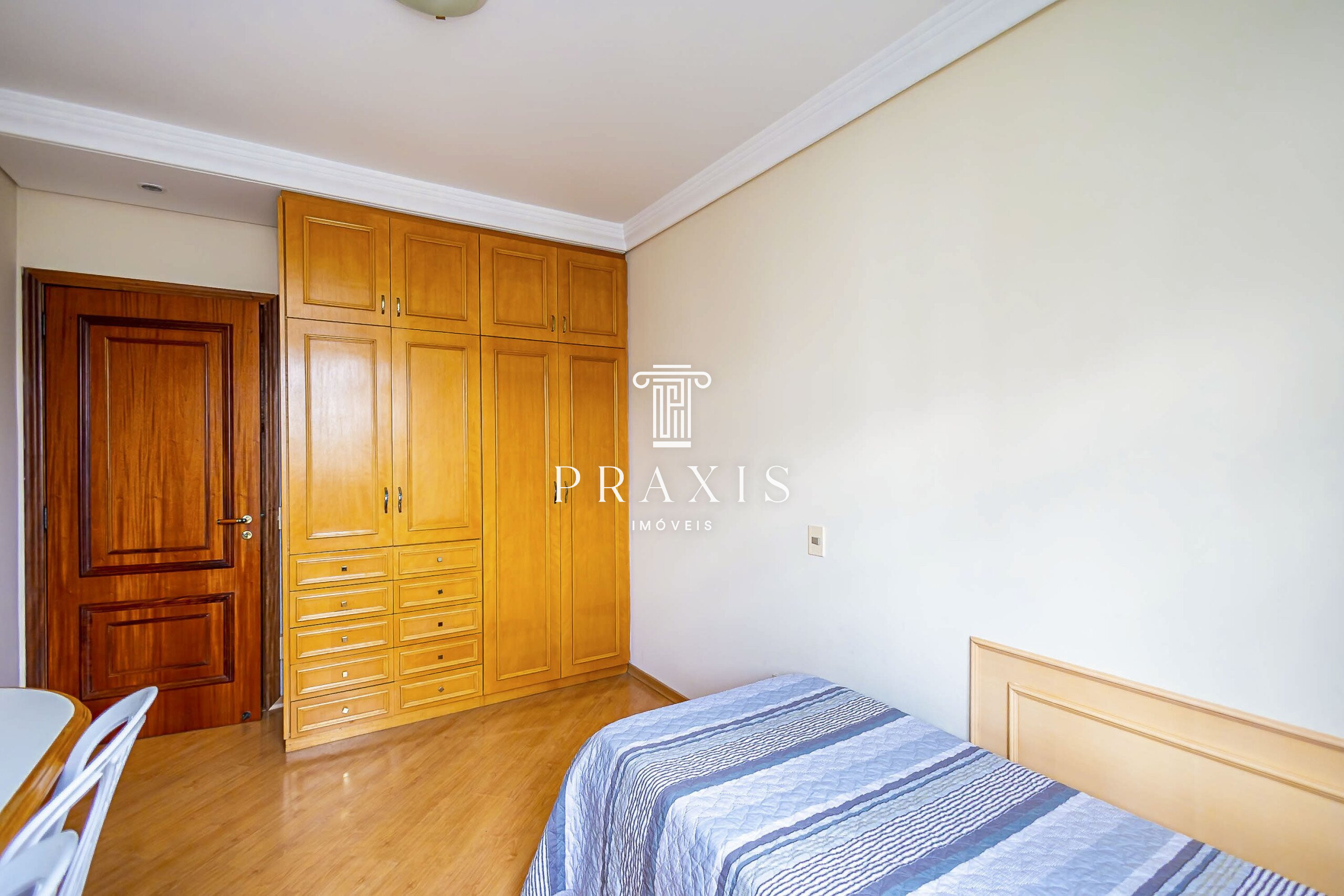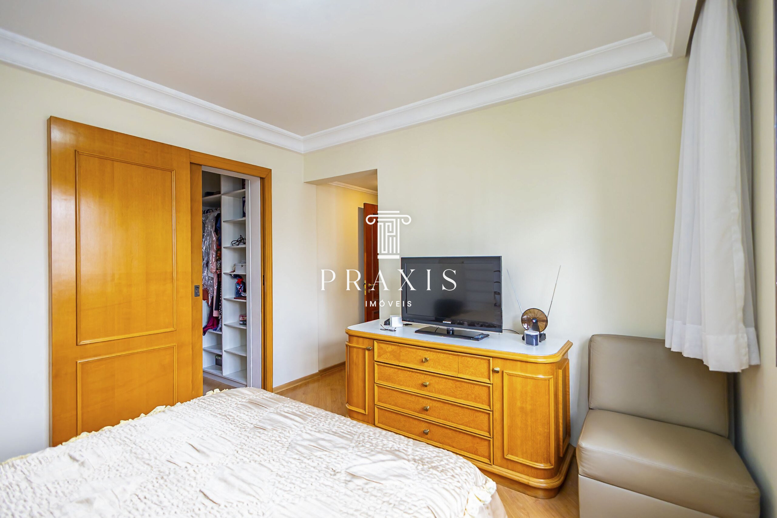 Na área íntima, o apartamento dispõe de quatro dormitórios, sendo duas suítes (uma delas com closet), além de banheiro social, garantindo conforto e privacidade para toda a família.