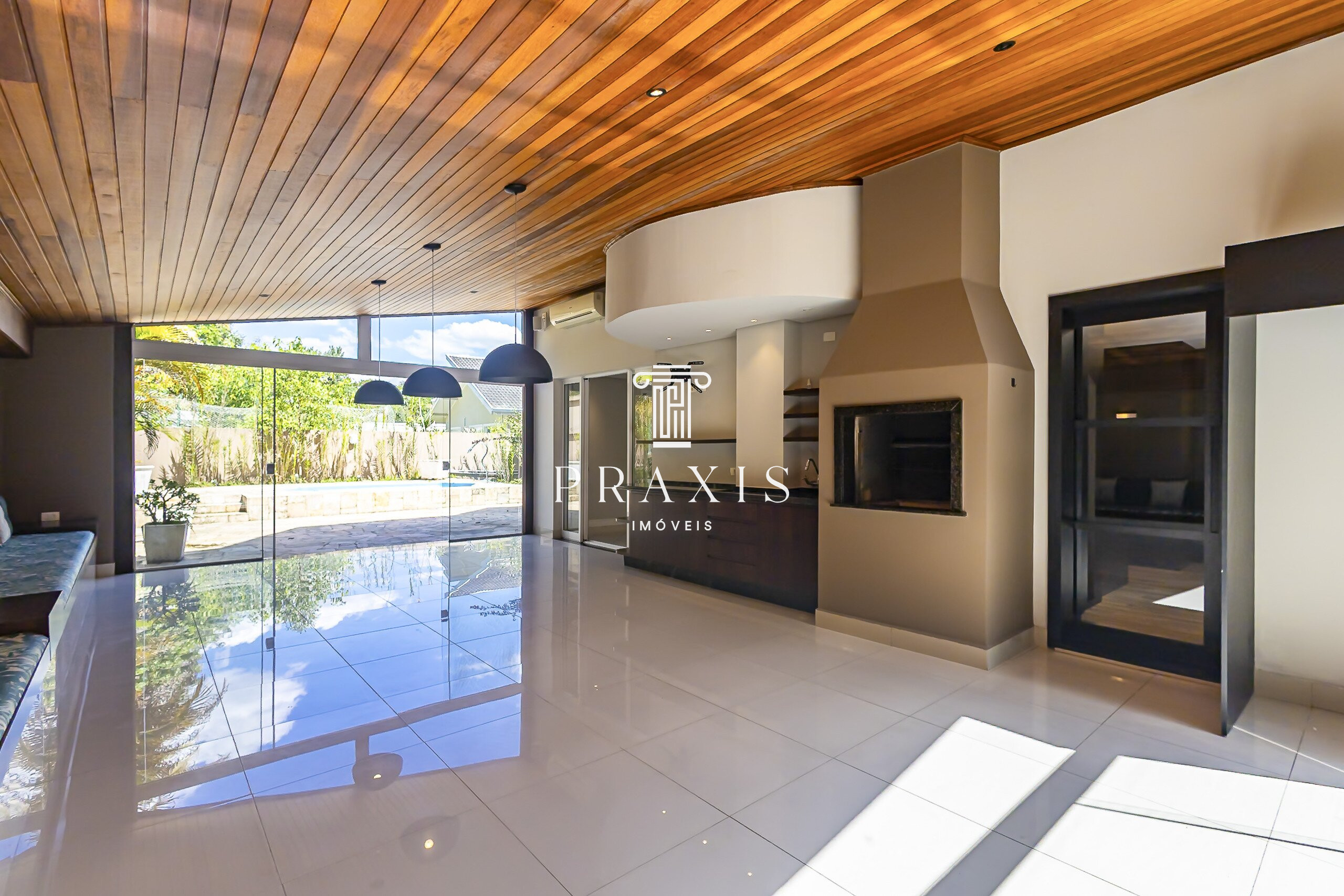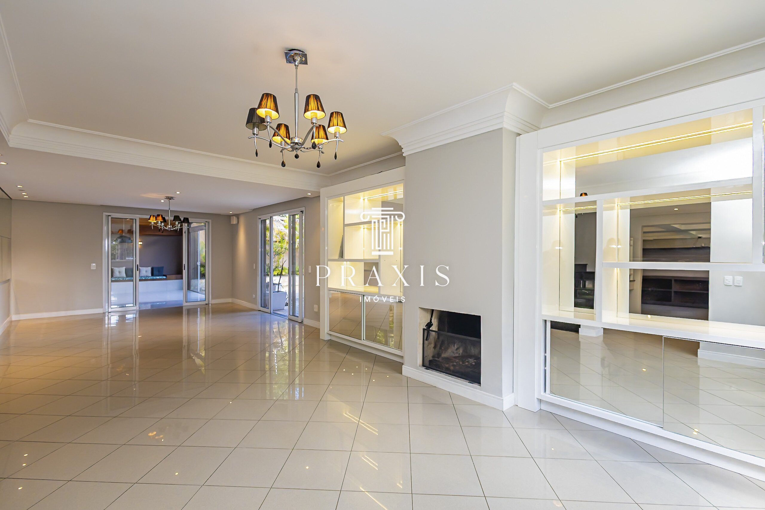 No piso térreo, temos uma charmosa área social desta casa é um convite ao convívio: um living amplo e integrado, com três ambientes distintos (sala de estar com lareira, sala de jantar e sala íntima que pode ser perfeitamente utilizada como home theater) garantindo conforto e versatilidade para o dia a dia e para recepções. Logo ao lado, um espaço de churrasqueira generoso se conecta de forma harmônica à sala, criando uma atmosfera acolhedora para encontros entre família e amigos. Ainda neste piso, temos uma cozinha maravilhosa, com móveis panejados , uma área de serviço e um lavabo.