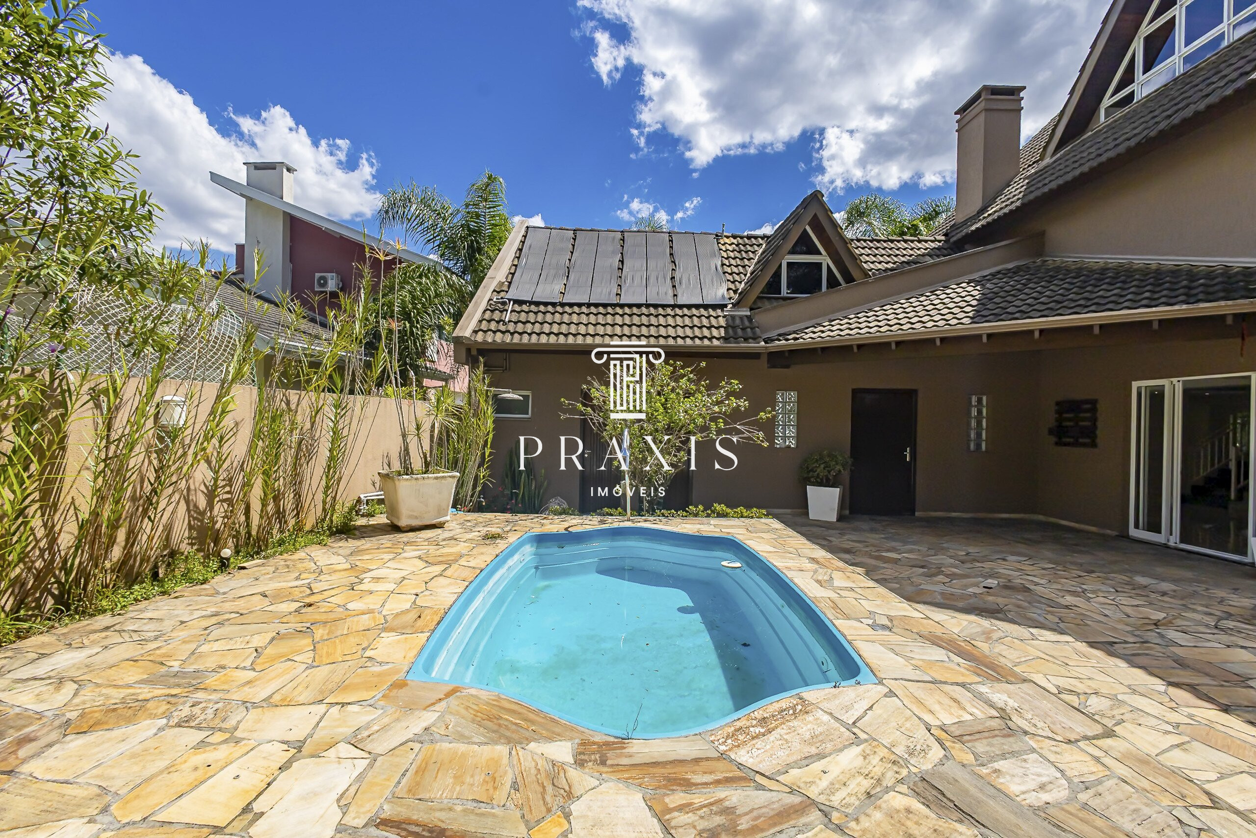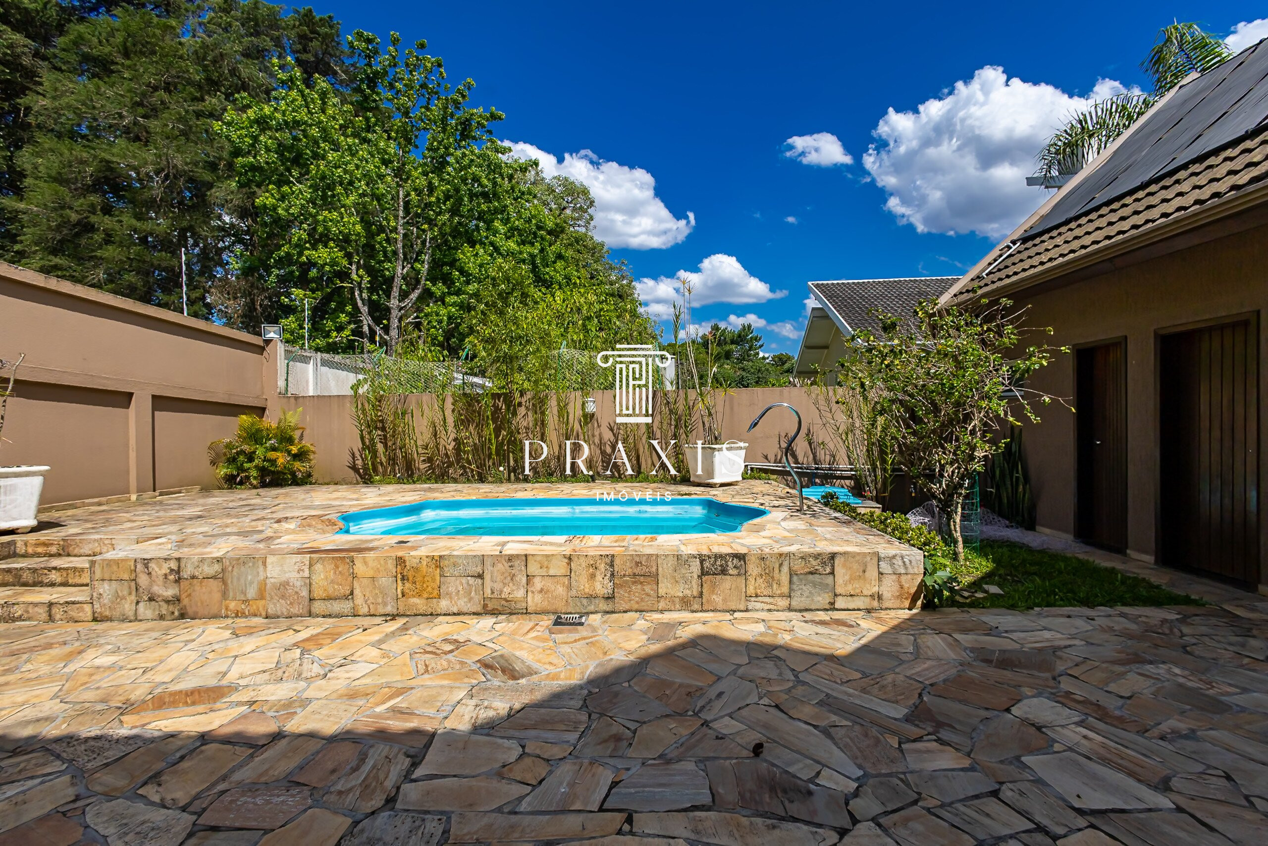 A área externa complementa a experiência com uma piscina privativa e um banheiro exclusivo para atender à área de lazer, além de um espaço adicional que pode funcionar como estúdio, depósito ou ambiente multiuso. Ao lado da garagem, um cômodo destinado a oficina oferece praticidade para organização, manutenção ou projetos pessoais.