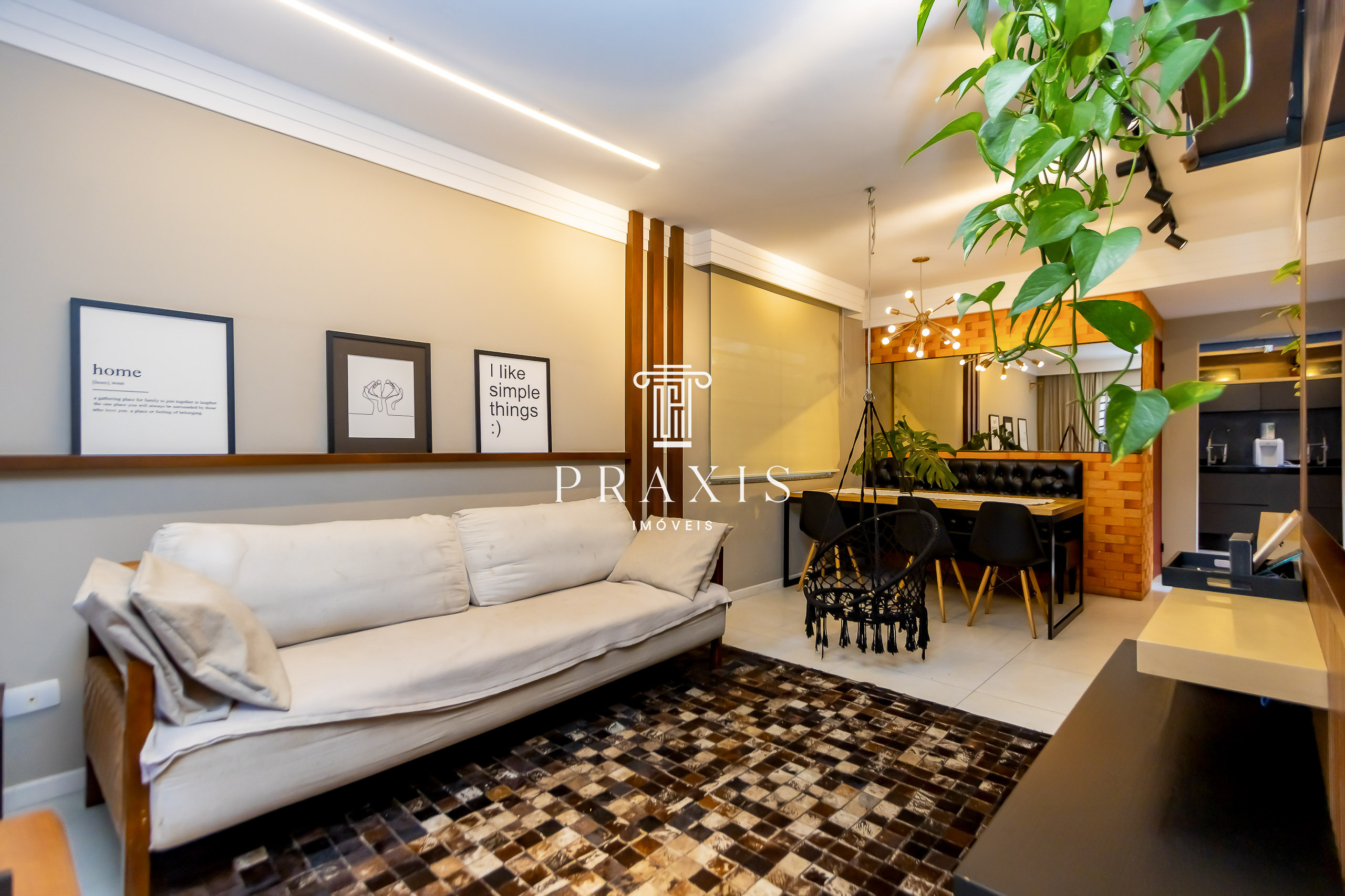 Sala para dois ambientes com painel de TV planejado, canto alemão, teto rebaixado em gesso com projeto luminotécnico, piso em porcelanato polido retificado
