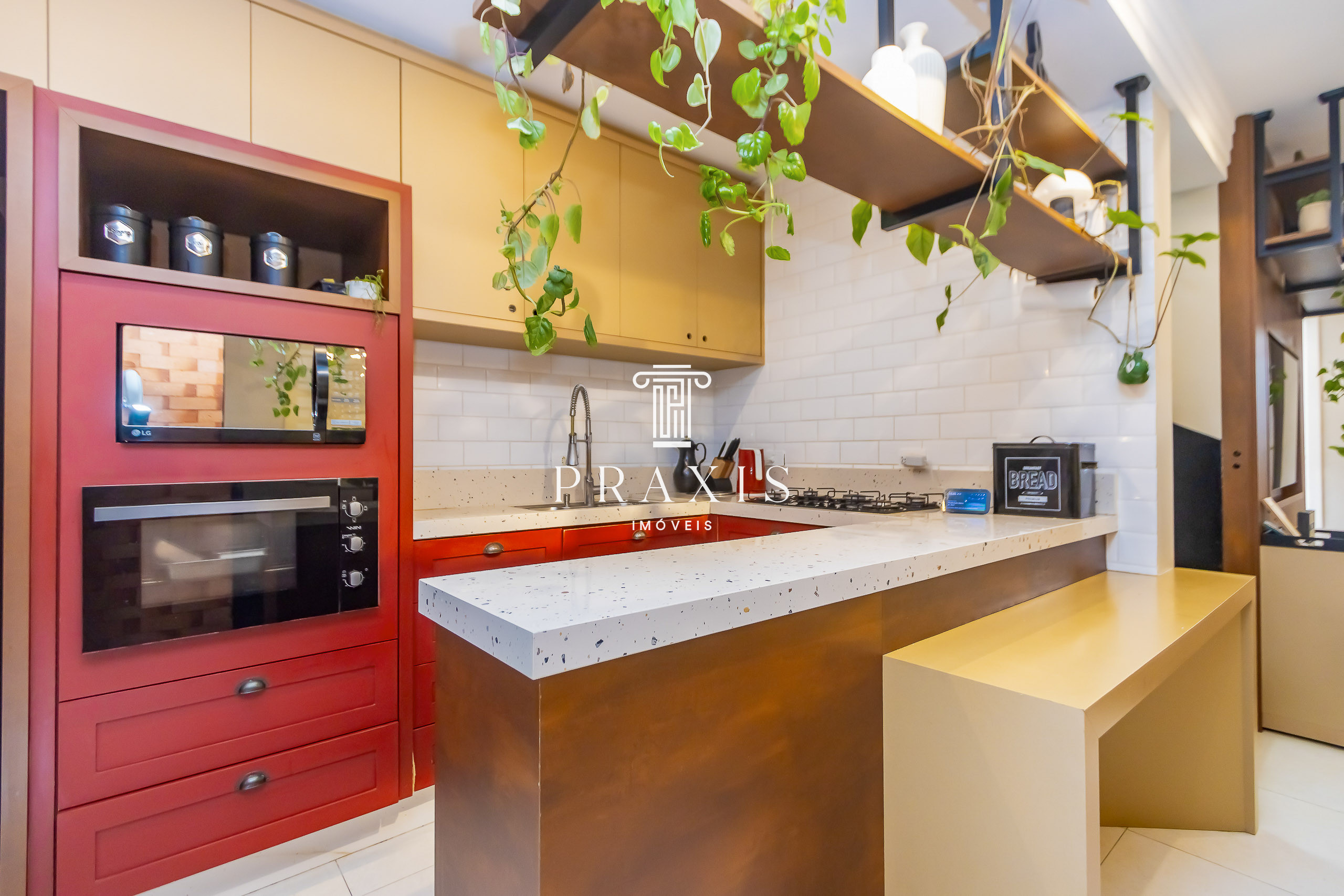 Cozinha em conceito aberto com móveis planejados de alto padrão, piso em vinílico, teto rebaixado em gesso com projeto luminotécnico