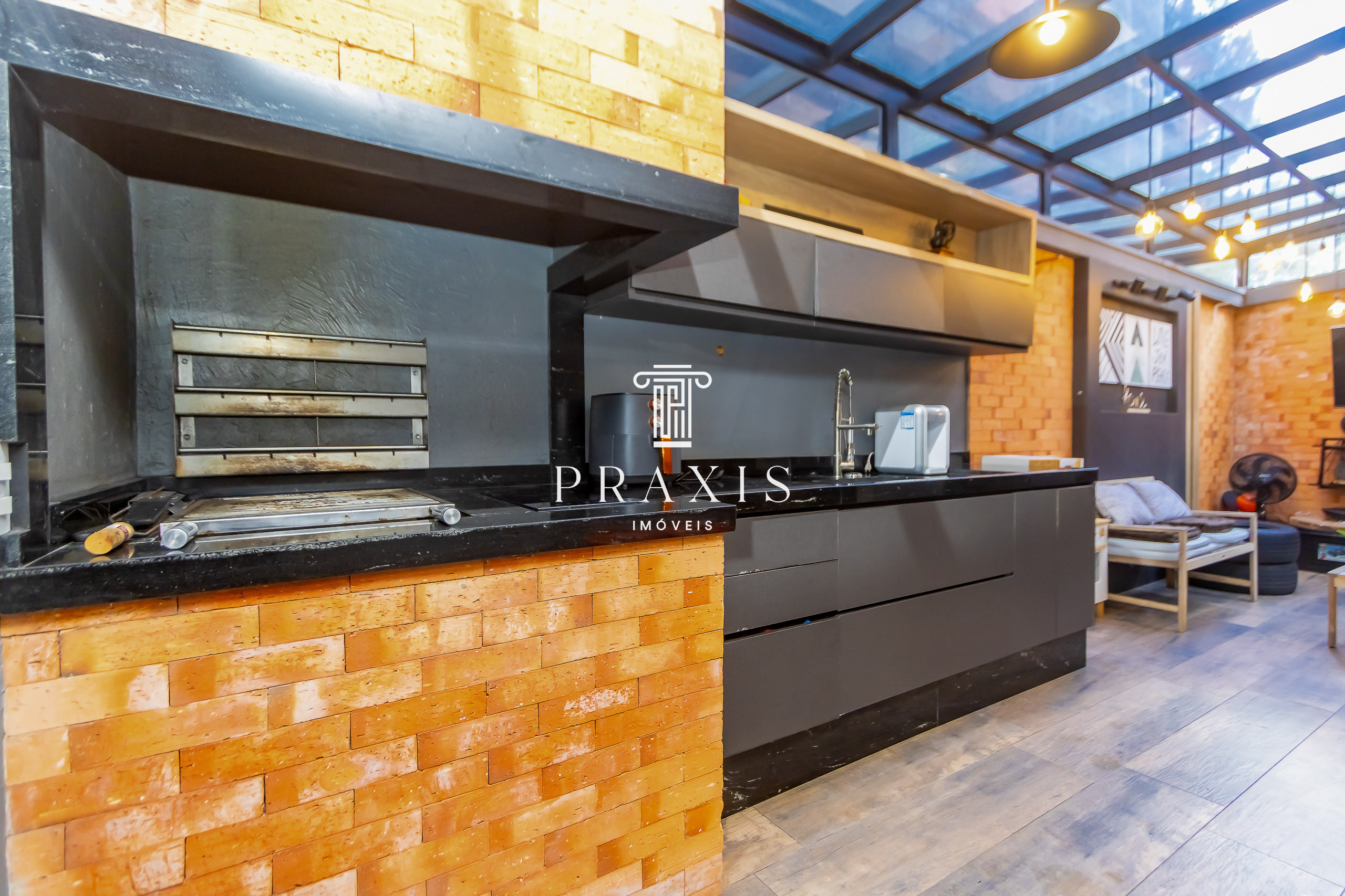 Lavanderia e área de churrasqueira coberta com móveis planejados