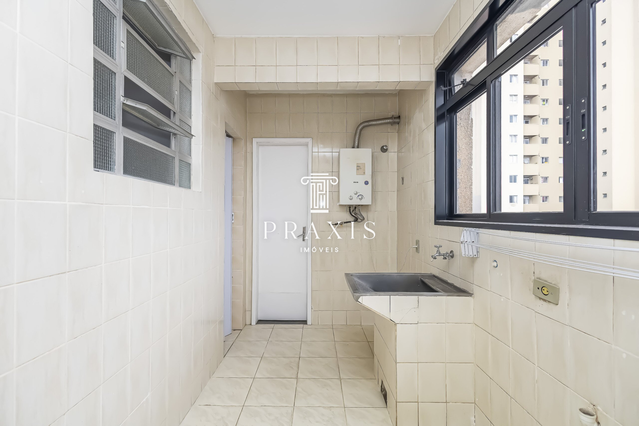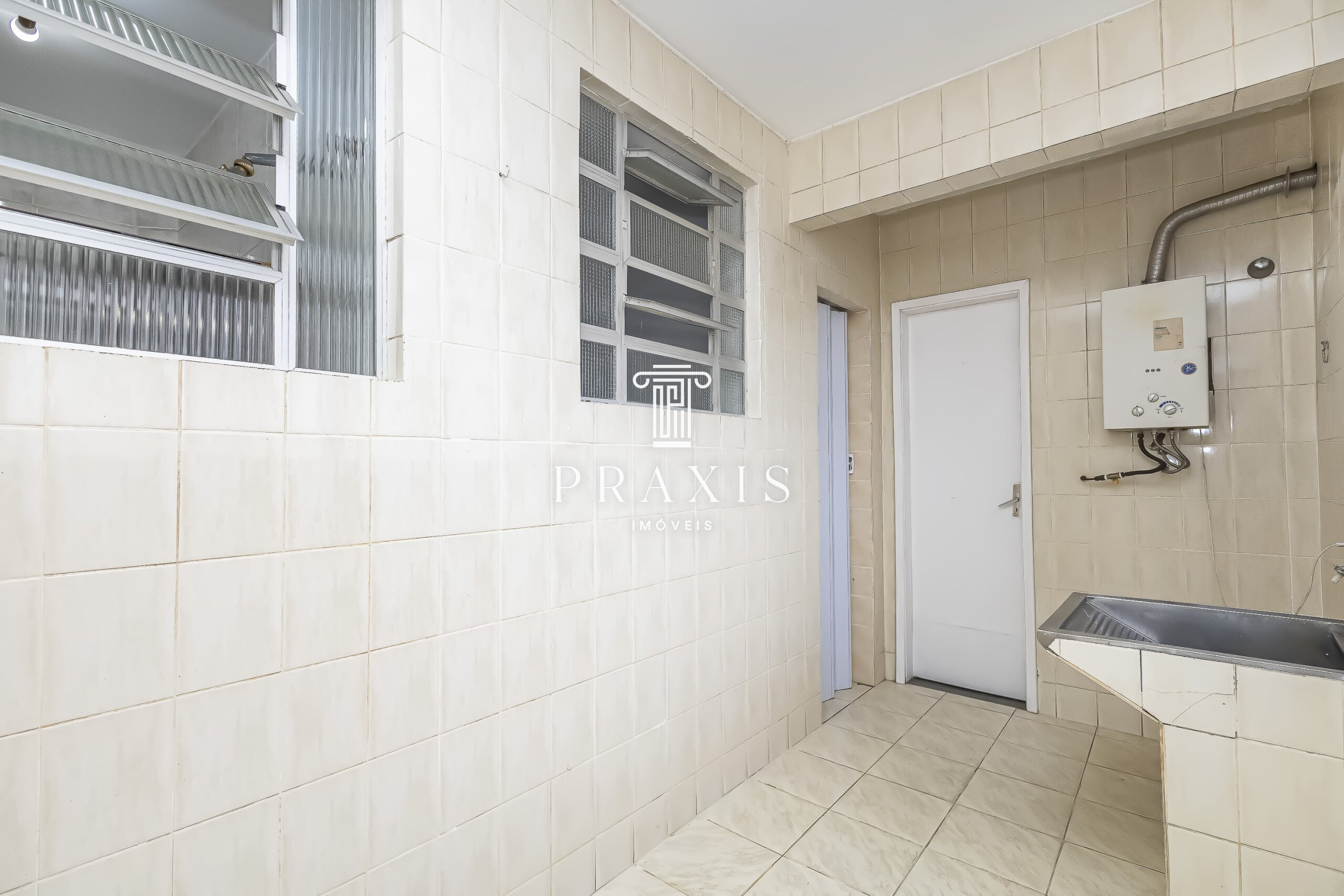 . Área de serviços ampla, separada da cozinha, com tanque e aquecedor a gás