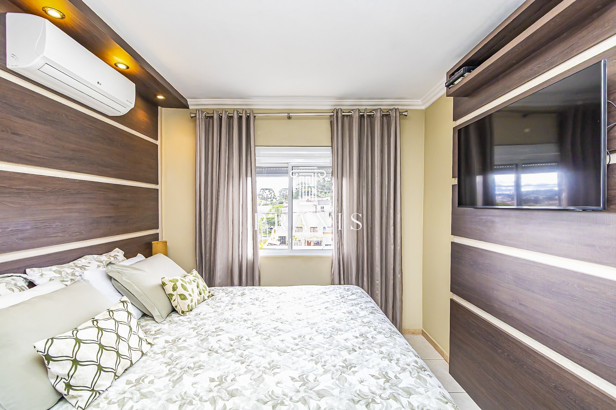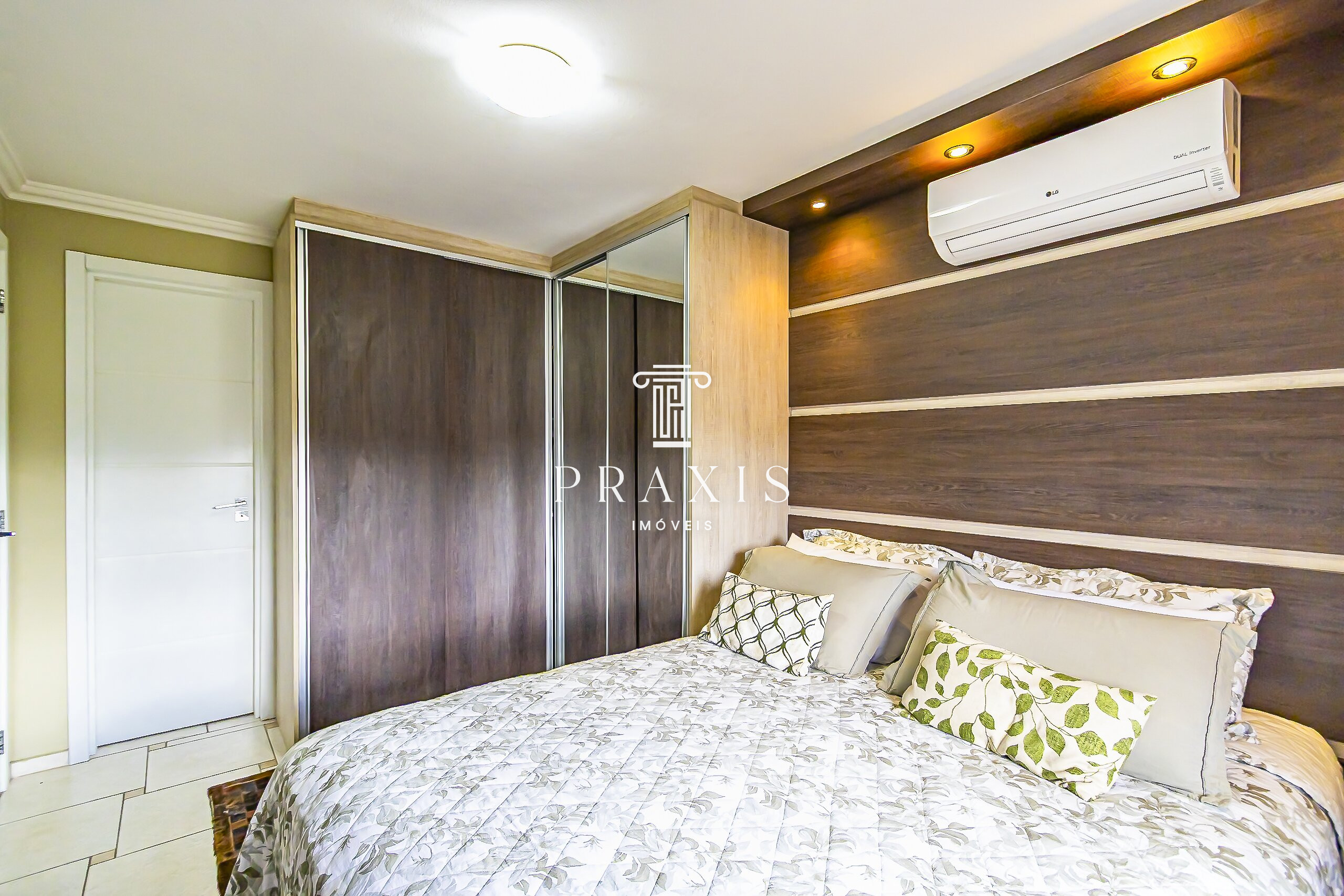 Excelente suíte com móveis planejados e ar condicionado, janelas com venezianas fixas.