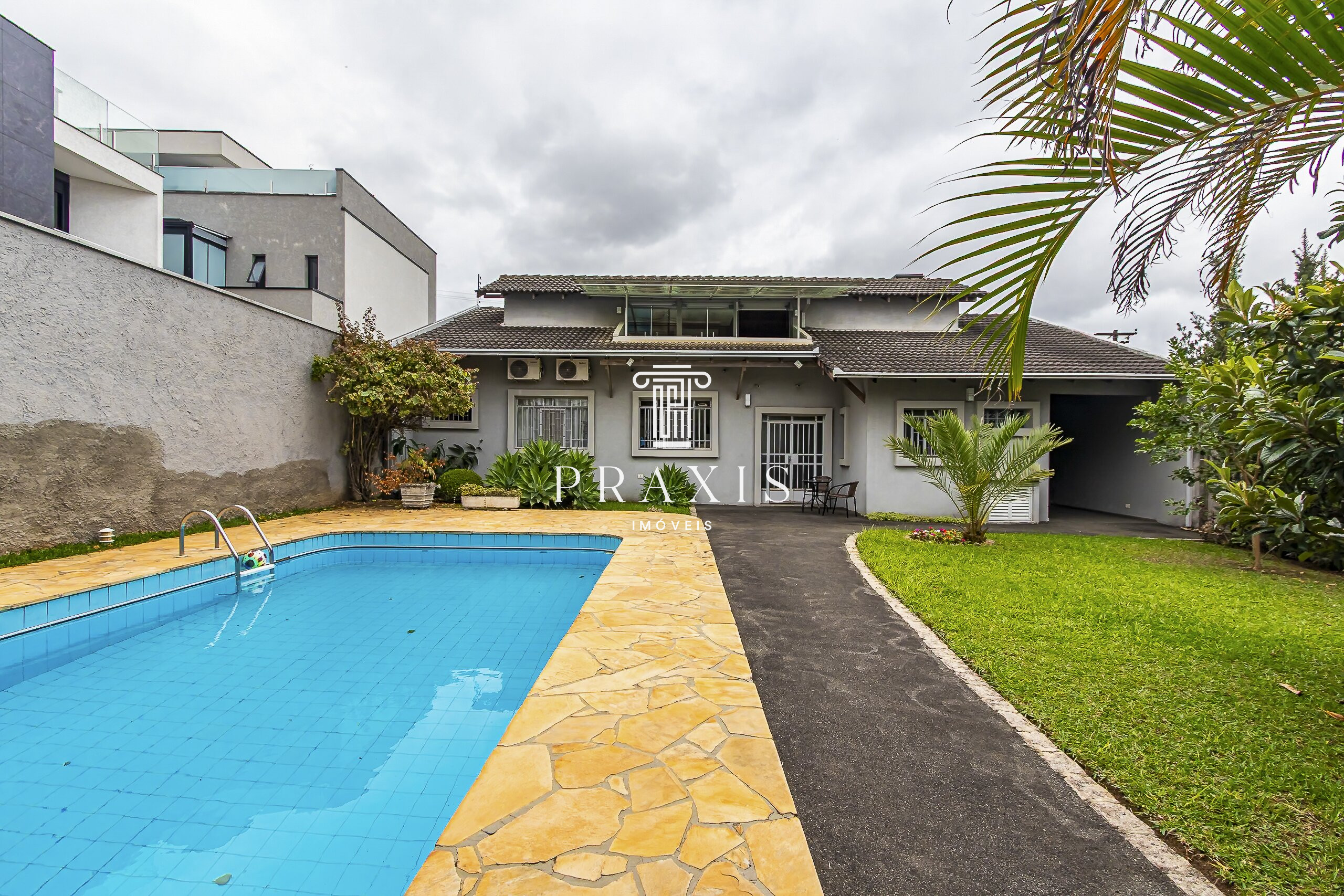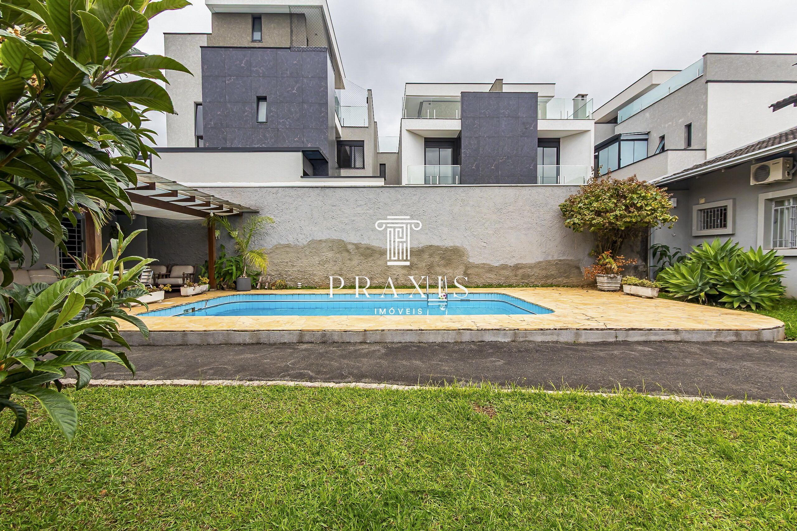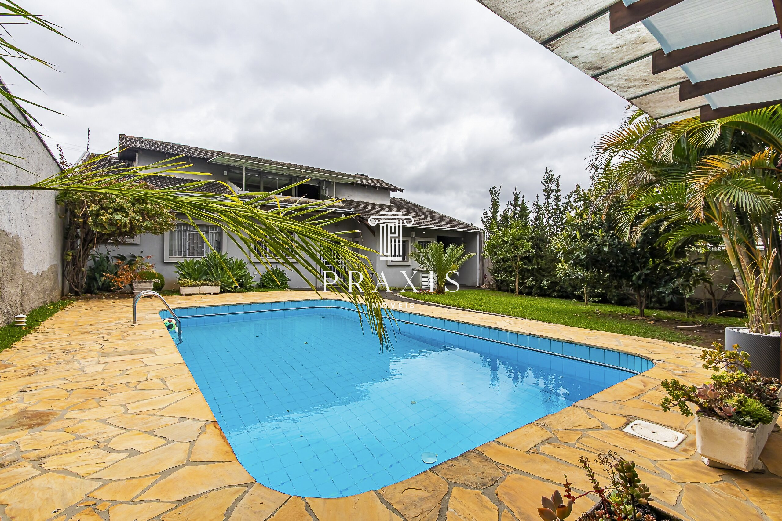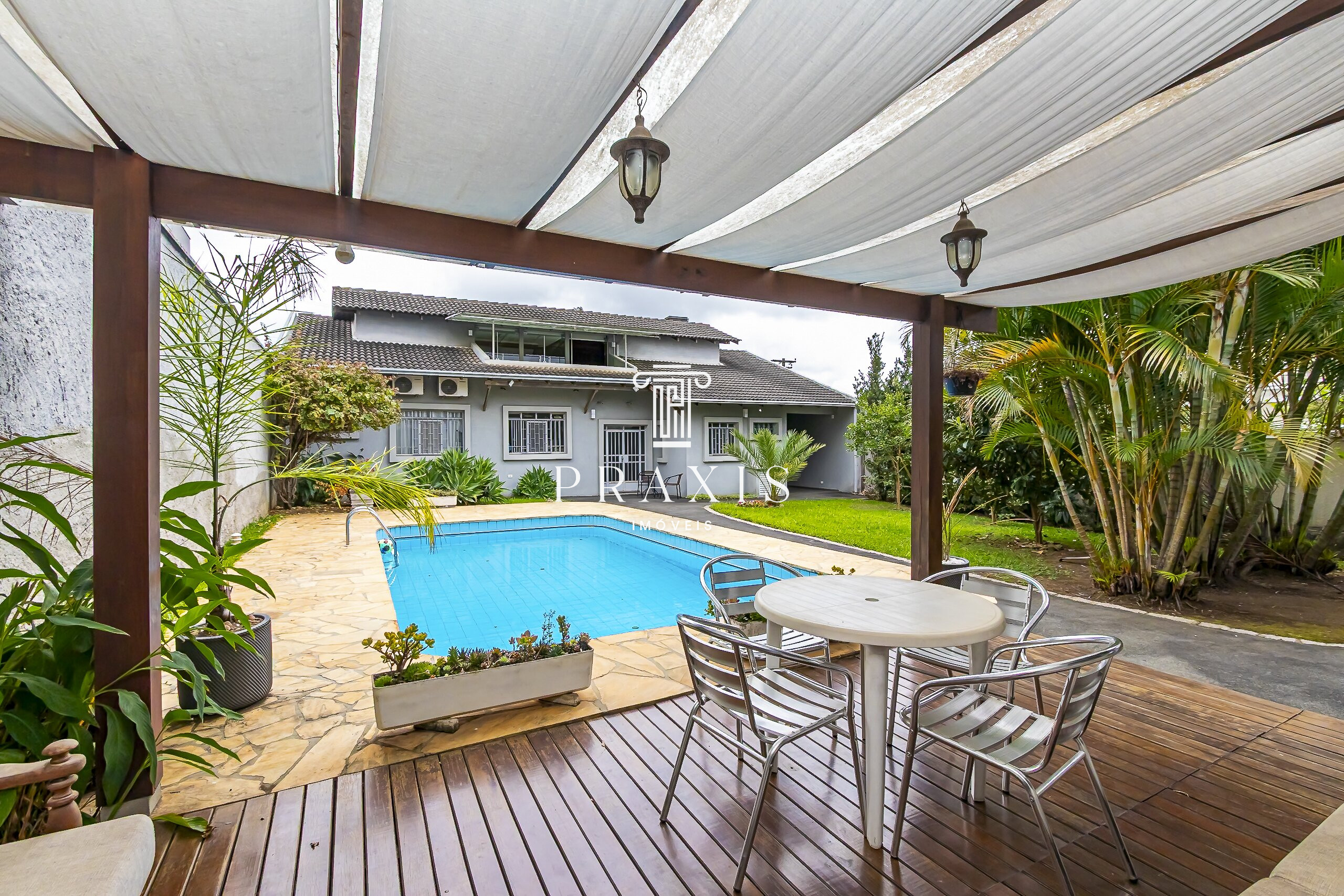Nos fundos, o destaque fica por conta do amplo quintal com muito verde, excelente piscina e uma edícula com espaço gourmet e churrasqueira, perfeito para momentos de lazer e convivência. O imóvel conta ainda com depósito, área versátil e 6 vagas de garagem, sendo 2 cobertas.