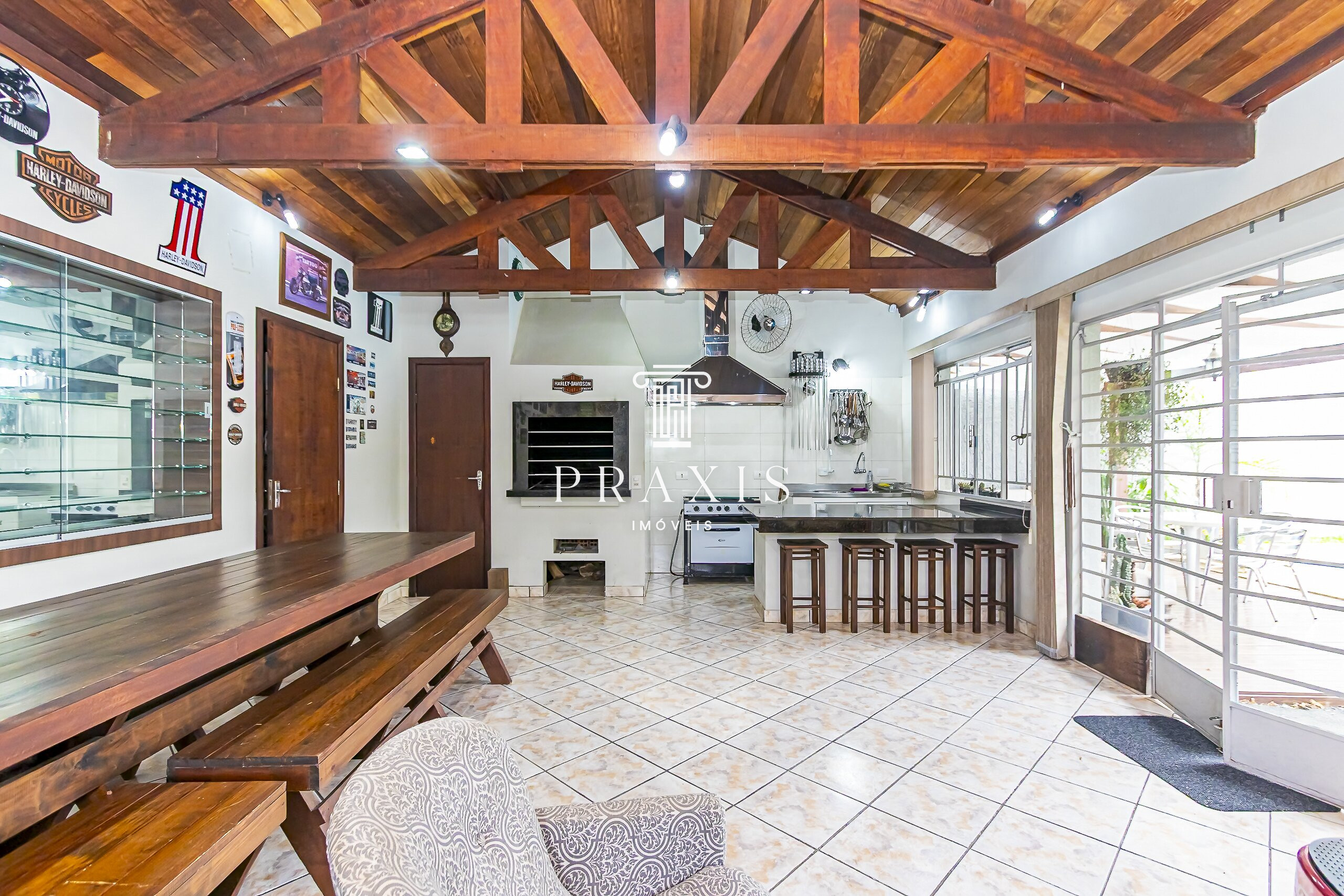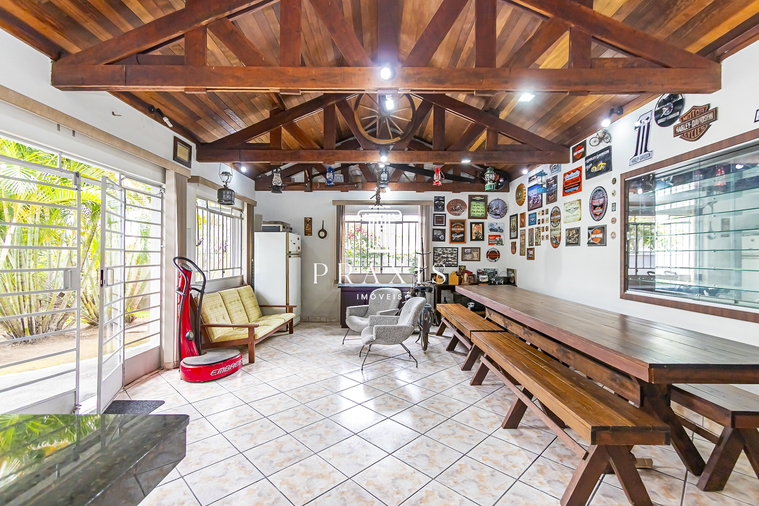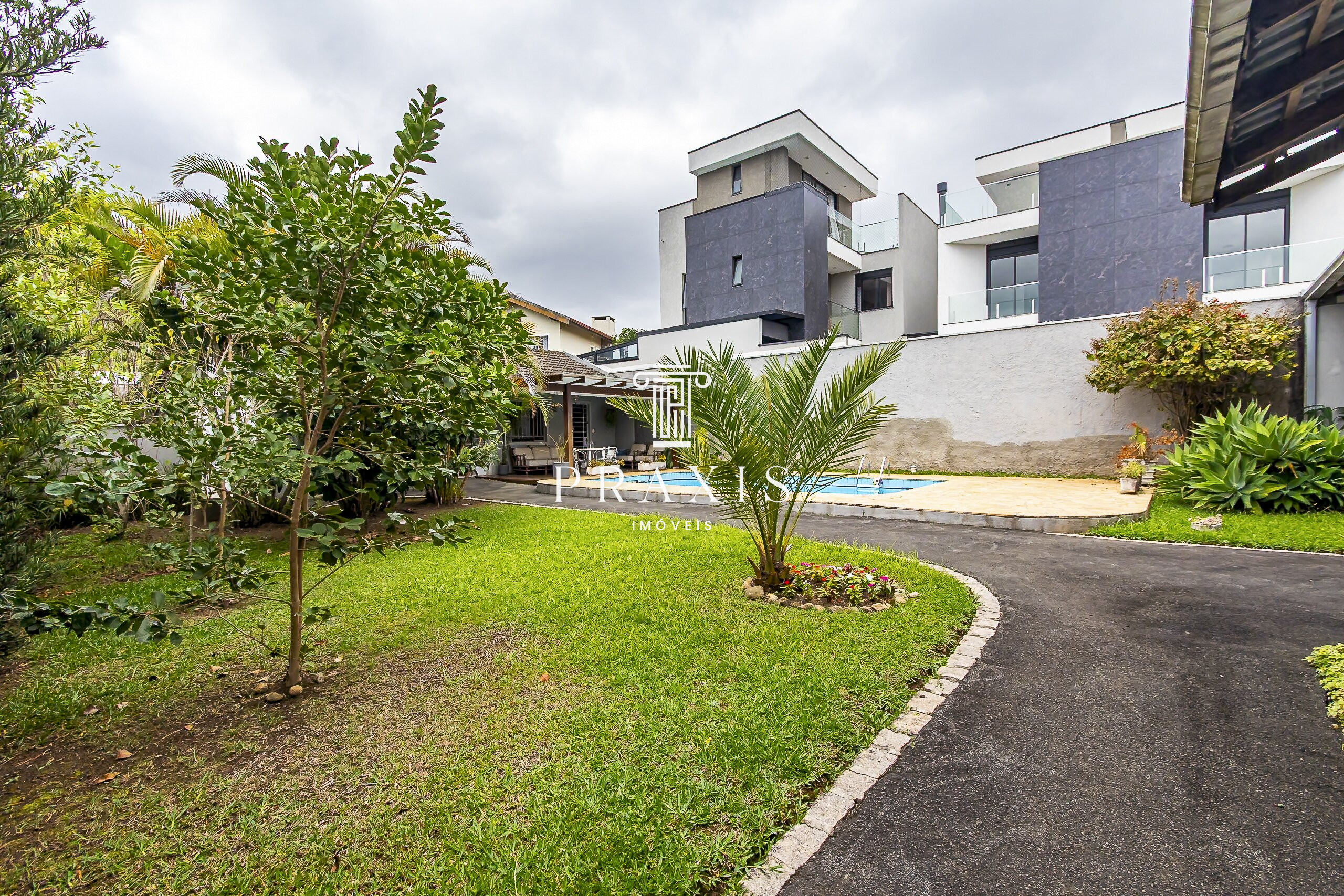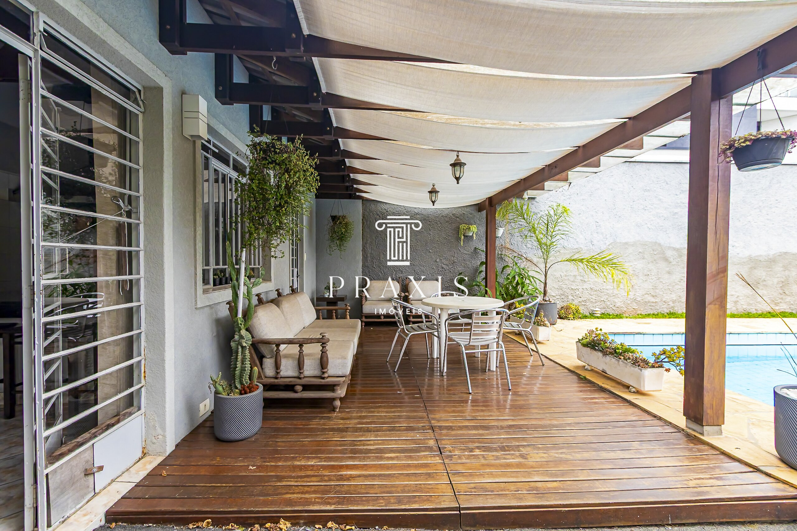 Nos fundos, o destaque fica por conta do amplo quintal com muito verde, excelente piscina e uma edícula com espaço gourmet e churrasqueira, perfeito para momentos de lazer e convivência. O imóvel conta ainda com depósito, área versátil e 6 vagas de garagem, sendo 2 cobertas.