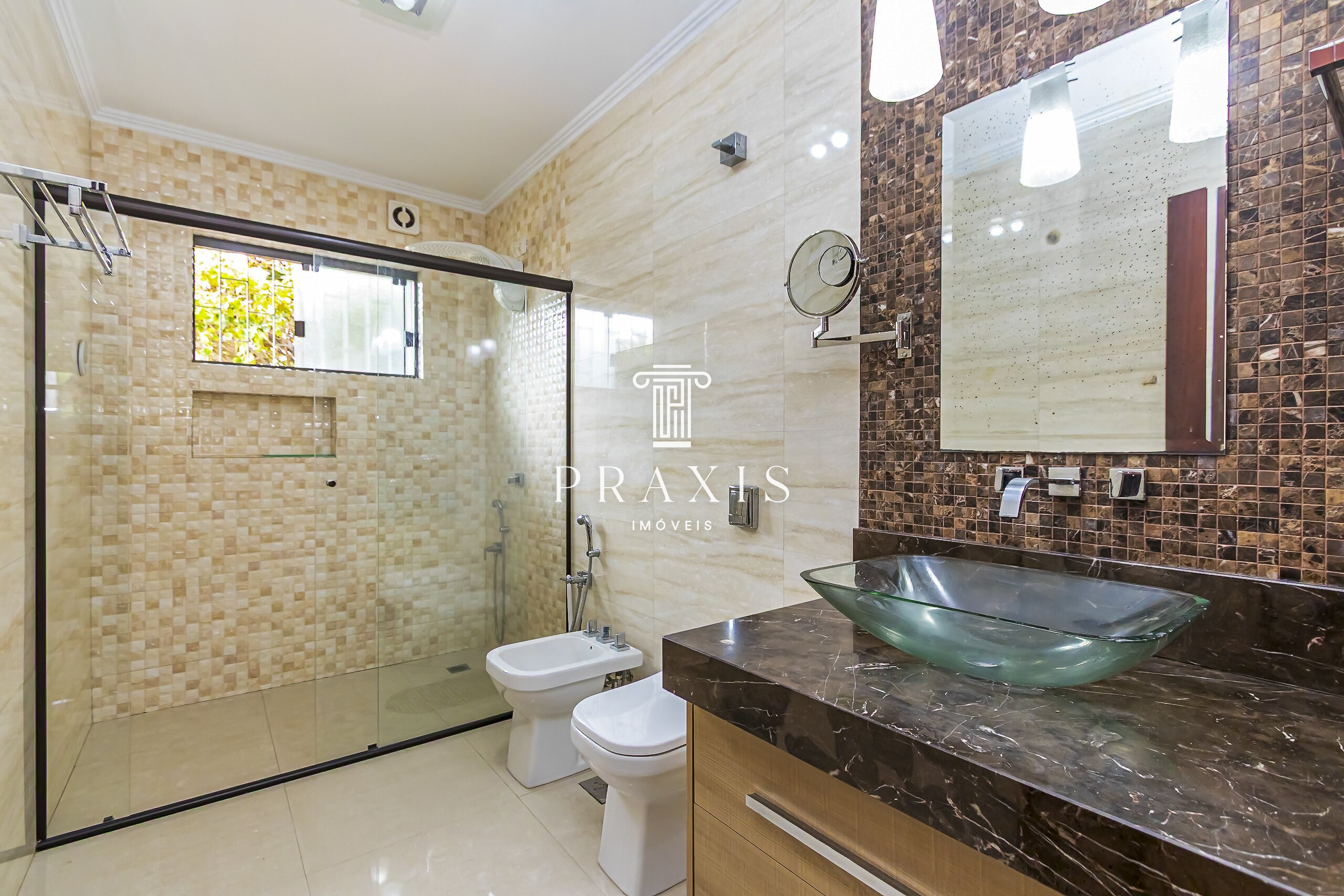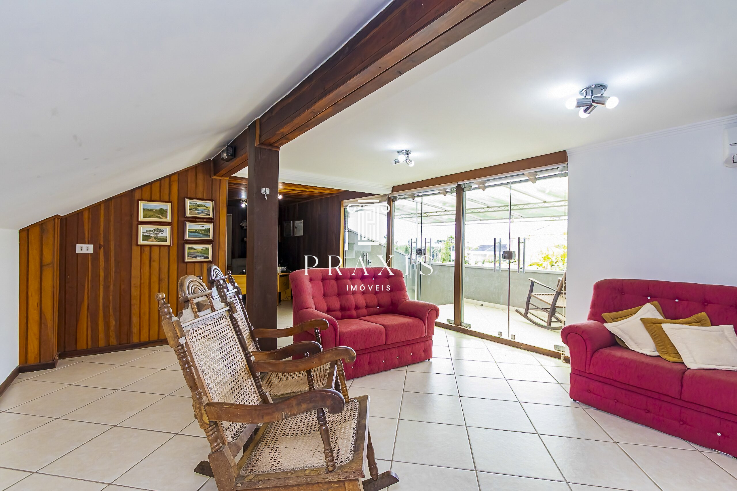 São 4 dormitórios no térreo, sendo 1 suíte, além de banheiro social. No piso superior, um mezanino com dois ambientes e sacada traz versatilidade e um toque de aconchego.