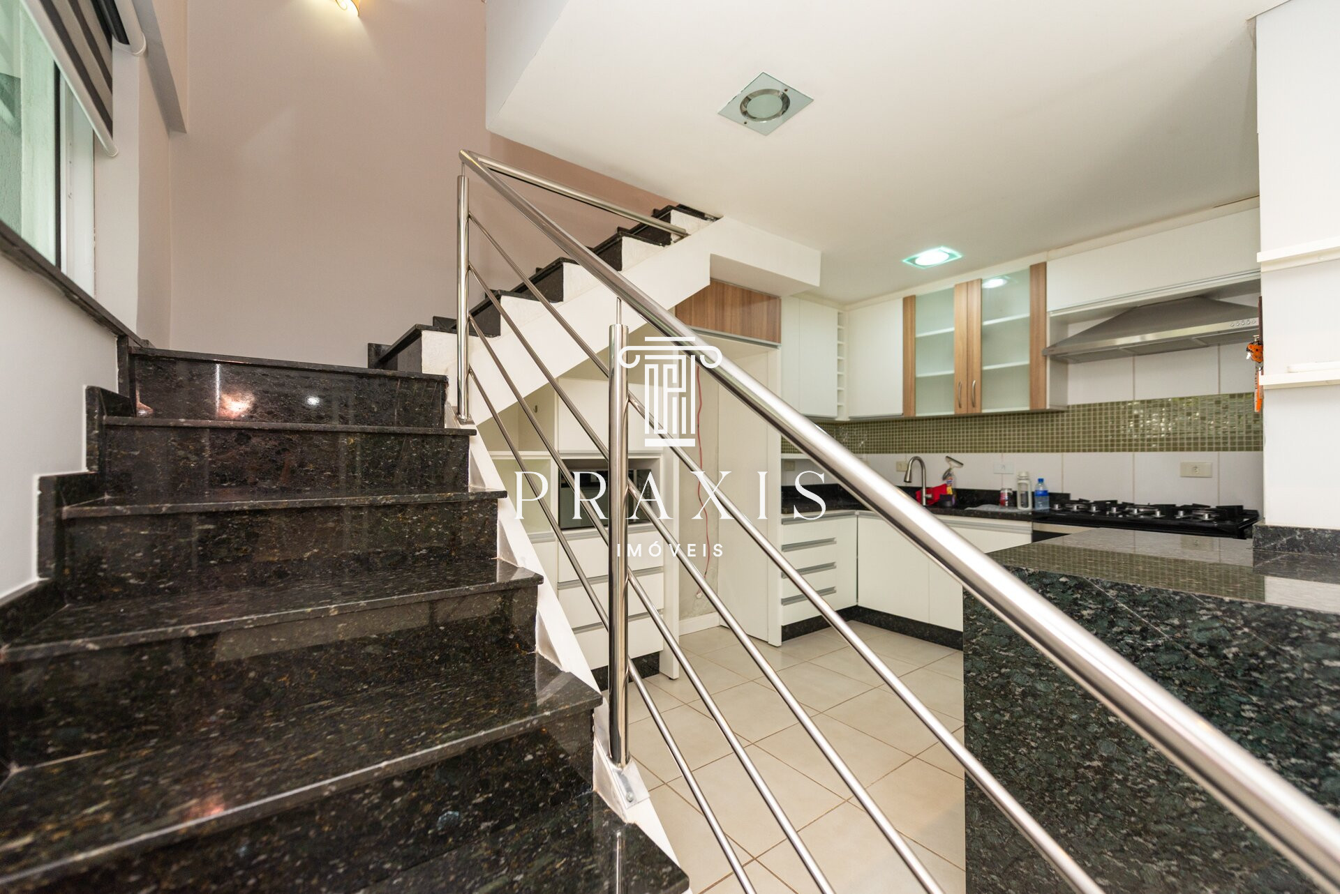 Escada revestida em granito com guarda corpo em aço inox escovado